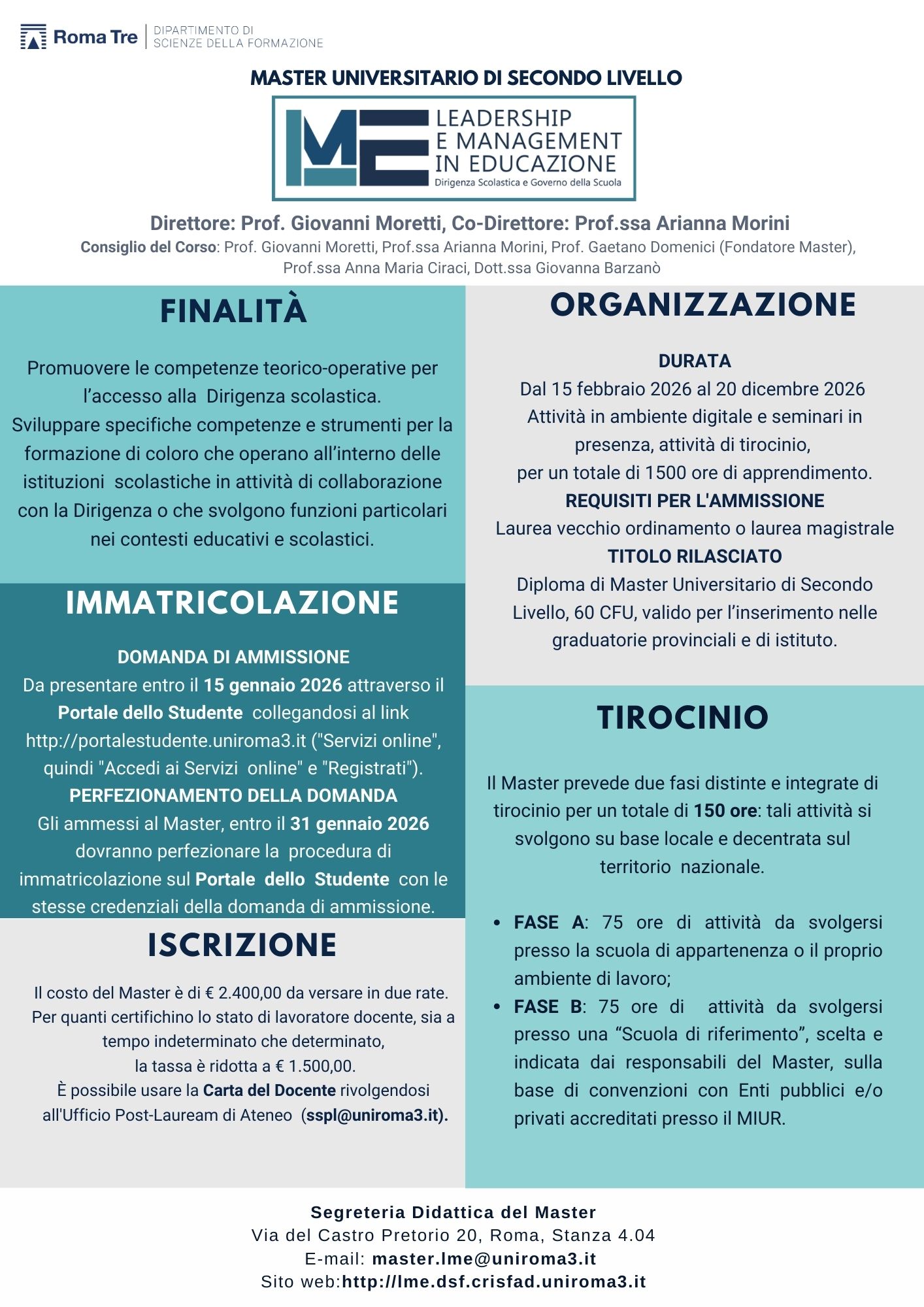 Tutti coloro che hanno perfezionato l'immatricolazione entro il 31 gennaio 2026 pagando le quote relative al bollo e al diploma (pari a € 41) riceveranno a breve comunicazione dell'avvenuta iscrizione. Le credenziali per accedere all'ambiente online del Master LME verranno trasmesse via mail.